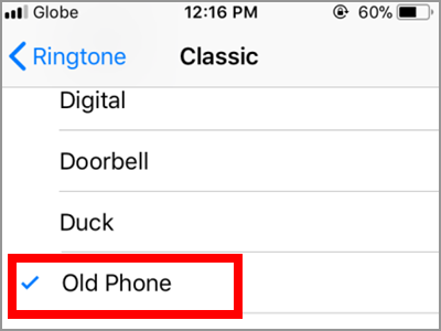 5. Choose from the various ringtones available on your list. Like in the Text tone, the Ringtones also have the Classic tab that has additional tones to explore. Choose one ringtone from the list.