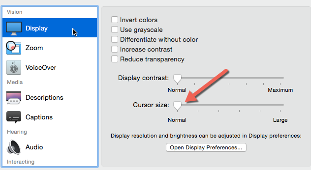 4. Close the preferences window. Whenever you want to switch back to the normal cursor size, go to the same location, and drag the slider all the way to the left.