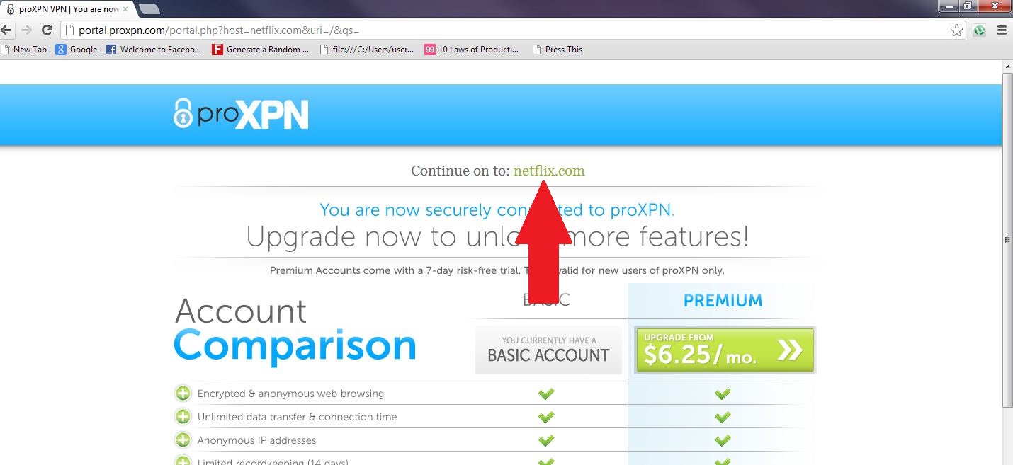 8. You are now connected to a US IP address. Open up your browser again, and visit netflix.com A proXPN page should come up instead. If it does, don’t worry; you’ve done everything correctly. Now Click on Continue on to: netflix.com.