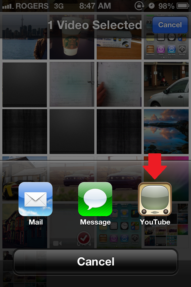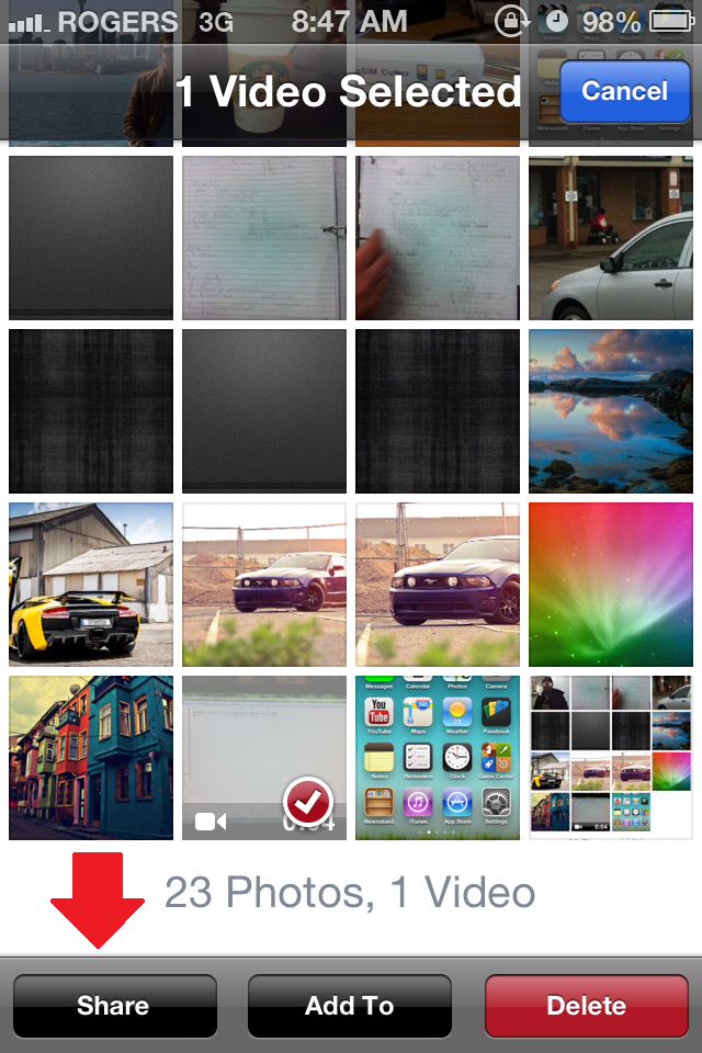 3.Select the Video that you would like to upload and press the Share button.