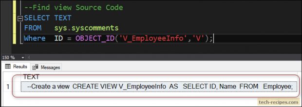 USE tempdb; GO --Find view Source Code SELECT TEXT FROM sys.syscomments Where ID = OBJECT_ID('V_EmployeeInfo','V');
