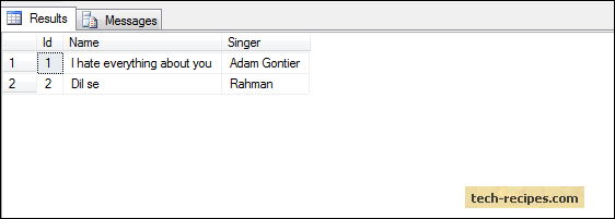 INSERT INTO dbo.Songs ( Id, Name, Singer) VALUES (2, 'Dil se', 'A. R. Rahman');