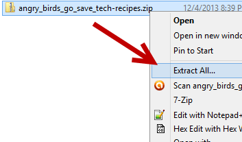 4. Next, we will override your current saved game with a new one. Download the following Angry Bird Go! save file. Once the download process is completed, right-click on the file, and choose Extract All. The results are two files: save_guest.dat and save_guest_backup.dat.