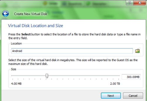 5. Choose Create new hard disk and click on Next. A new window will pop up, click on Next->Dynamically expanding storage->Next->Name your vdi file, set its size (about 300mb is enough)->Next->Finish->Finish.