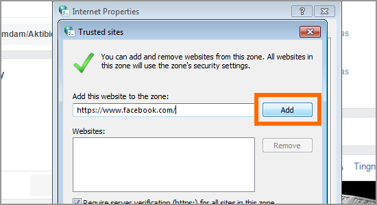 7.Enter the URL of your trusted site. For illustration purposes, enter https://www.facebook.com.