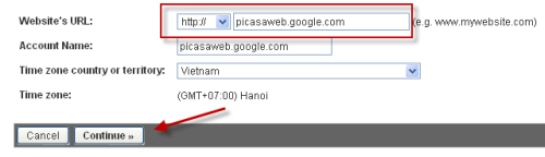 4. Fill in all required informations in General Information window. Remember to provide Website’s URL as: picasaweb.google.com. Hit Continue to jump to next page.