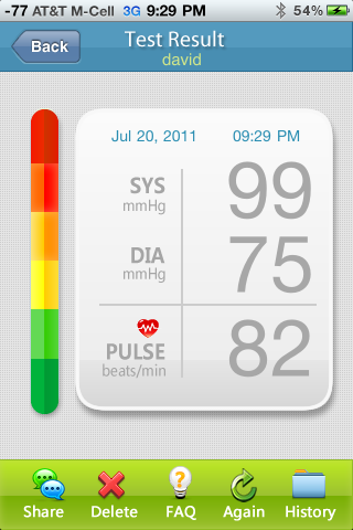 While the blood pressure and pulse are being measured, the application gives wonderful visual feedback. I enjoyed watching the actual pressure waves that are being detected. Other than being pretty, the pressure tracing is helpful in reminding the user to be still as the tracing is visibly altered with movement.