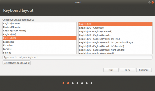 10.You can select the keyboard from the lists or you can start typing in the box below the lists if you want Ubuntu to automatically detect the layout. Click “Continue” to proceed to the next step