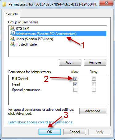 6. Back to the Permissions window, choose your account, check Full Control and hit OK.