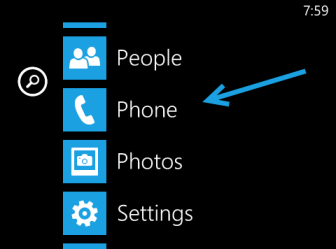 1. From the live tiles screen, swipe to the left side to access the list of applications. Choose Phone from the list to continue.